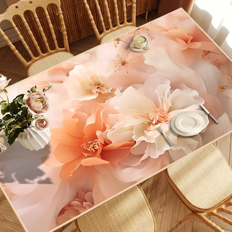 ピンクとホワイトの花々が美しく咲き誇るデザインのテーブルマットです。