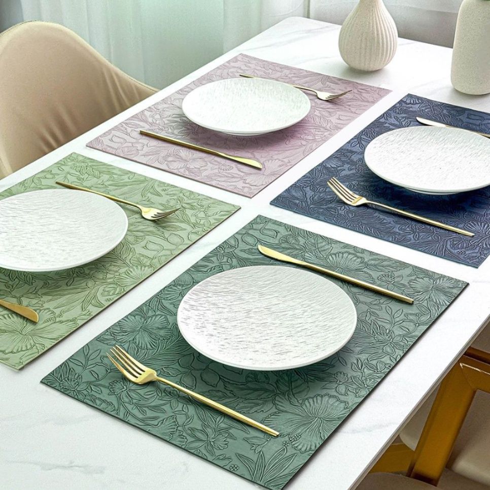 繊細な花と葉のモチーフが美しく型押しされた合皮のランチョンマットです。