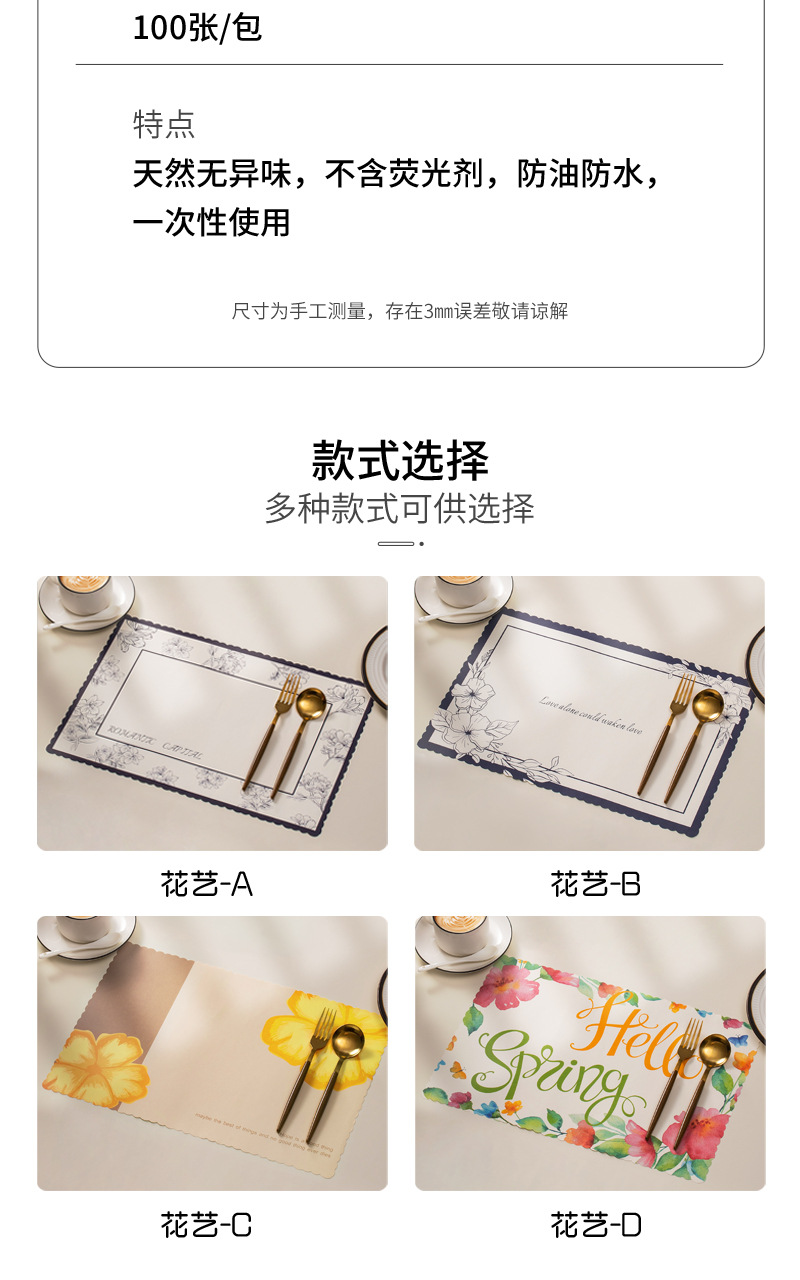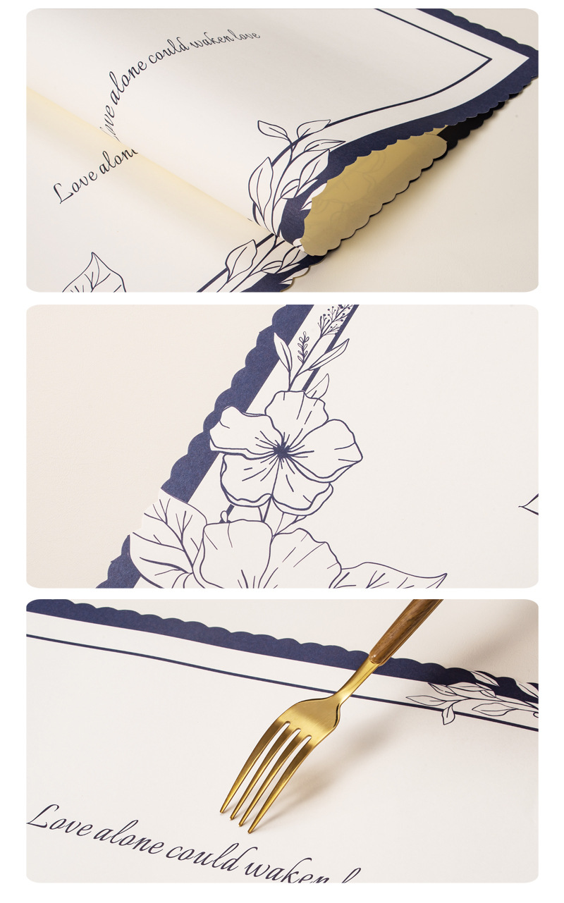 繊細な花模様と縁取りが美しい紙製のランチョンマットです。 加厚純木漿紙質を使用した高品質な仕上がりで、防油防水機能を備えています。 使い捨てタイプなので後片付けも簡単で、日々の食卓やおもてなしの場面で活躍します。 100枚入りの大容量で、カフェやレストランでの業務用としてもお使いいただけます。 4種類の花柄デザインから選べる、おしゃれで実用的な紙のランチョンマットです。
