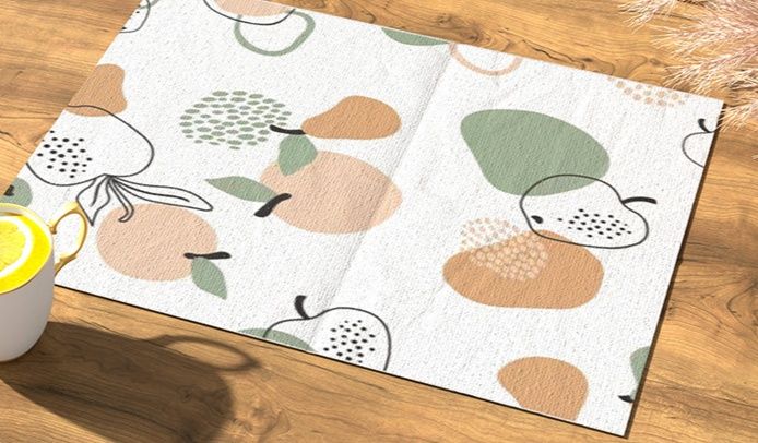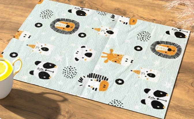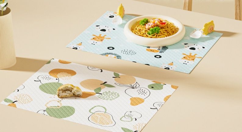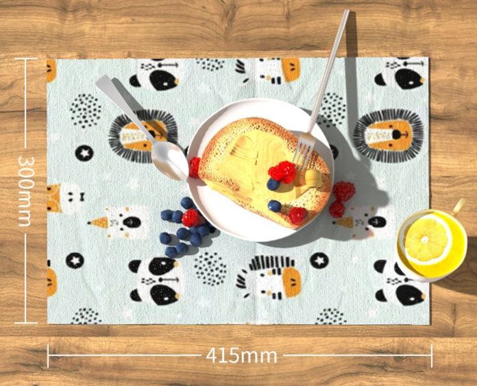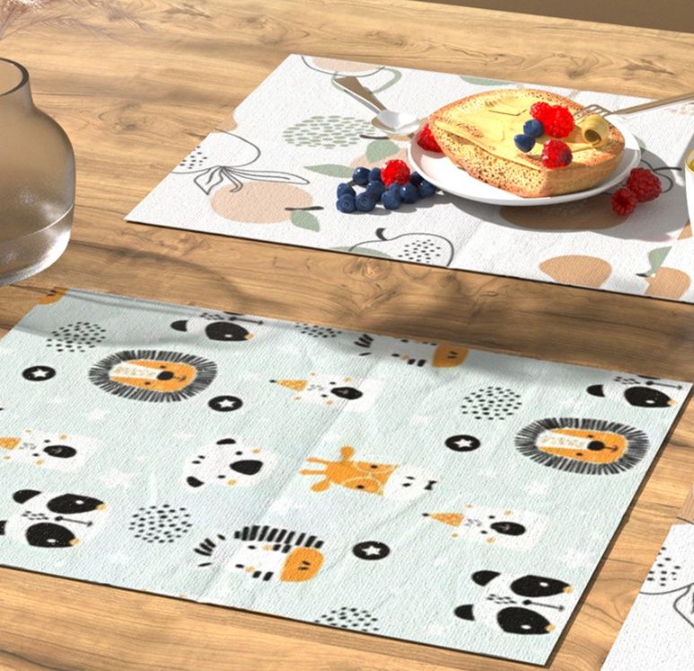 可愛らしいライオンやシマウマなどの動物やフルーツ柄がデザインされた紙製の使い捨てランチョンマットです。